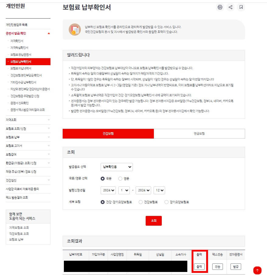 로그인을 하면 보험료 납부확인서가 나오면 프린터로 출력을 하거나 팩스전송 또는 전자증명서로 전송을 하면 됩니다.