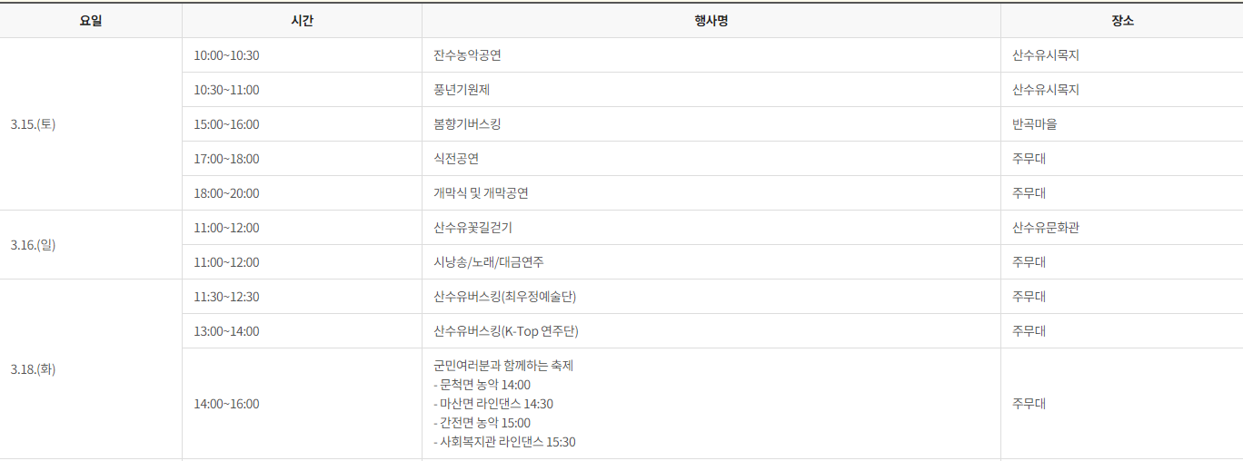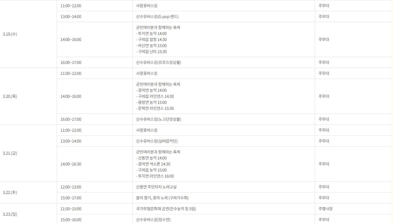 1. 개막공연 - 2025년 3월 15일(토) 18:00 ~ 20:00 주행사장(전남 구례군 산동면 좌사리 831)