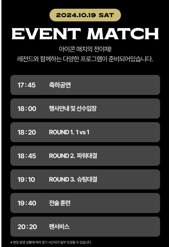 | 10월 19일 18:00 | 2024 아이콘 매치 : 창과 방패 -EVENT MATCH | 서울월드컵경기장 |