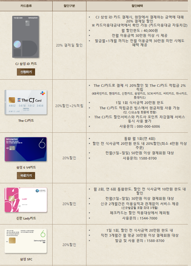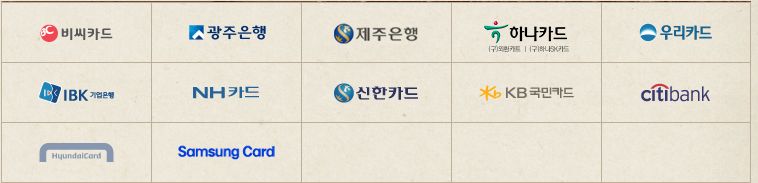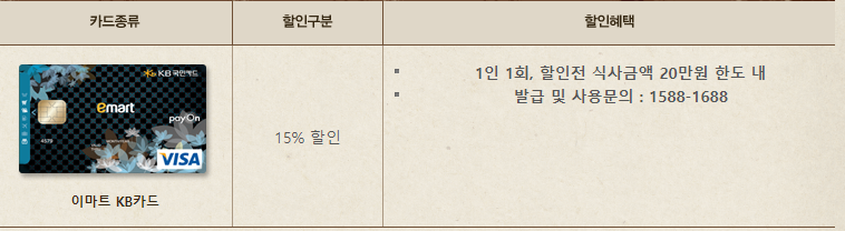 2. 제휴사별로 카드 적용이 변경될 수 있으니, 자세한 사항은 방문 전 반드시 각 카드사 홈페이지를 확인하시기 바랍니다.