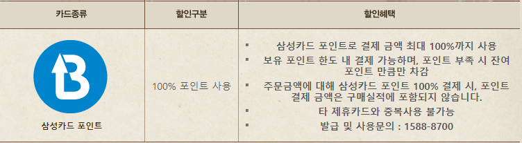 삼성카드 포인트로 결제시 100% 포인트 사용가능합니다.