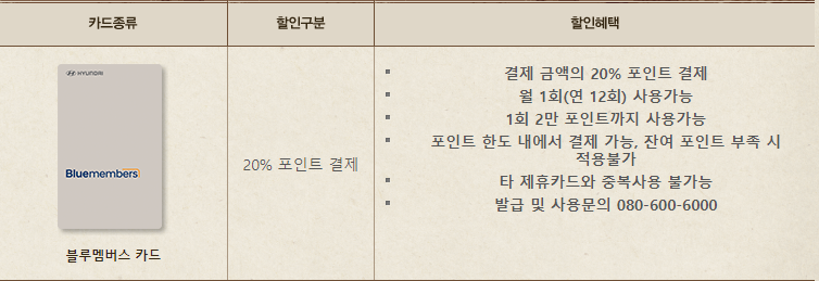 블루멤버스 카드로 결제시 최대 20% 포인트 결제 가능합니다.