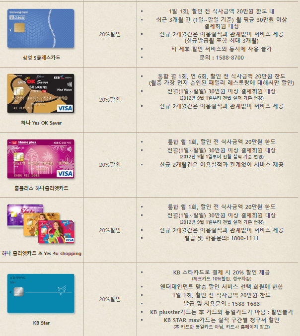 20 ~ 25% 할인카드는 다양하며, 카드마다 할인혜택이 다 상이하므로 방문전에 카드를 확인 후 방문하시기 바랍니다.