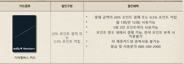 기아멤버스 카드로 결제시 20% 포인트 결제 또는 0.5% 포인트 적립을 할 수 있습니다.
