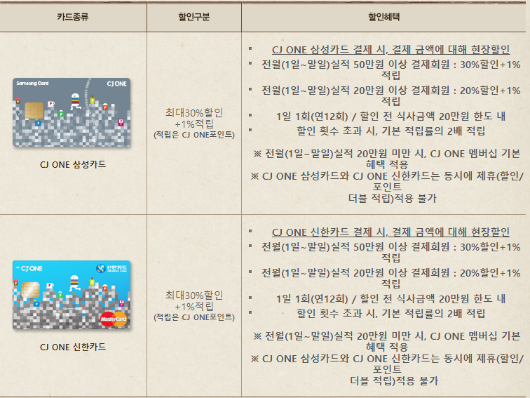 CJ ONE 제휴카드는 삼성카드와 신한카드가 있으며 전월(1일 ~ 말일) 실적에 따라 할인혜택이 다르게 적용이 됩니다. 전월실적이 50만원 이상이면 30% 할인혜택과 1%의 적립이 되며, 전월실적이 20만원 이상이면 20% 할인혜택과 1%의 적립을 할 수 있습니다.