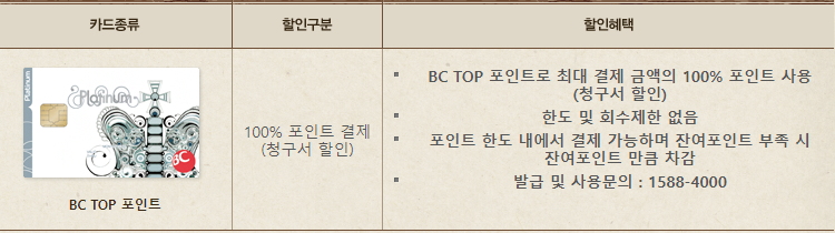BC TOP 포인트로 최대 결제금액의 100% 포인트로 사용가능합니다.