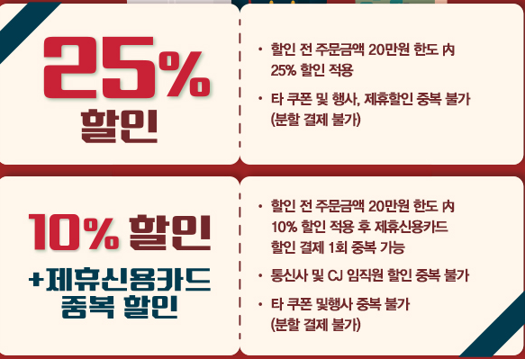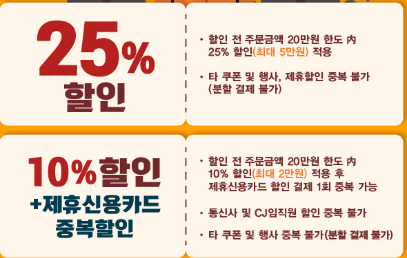 3. 중복할인이 가능한 쿠폰 사용시, 쿠폰 할인 후 나머지 금액에 대해 제휴카드 할인이 적용됩니다.
