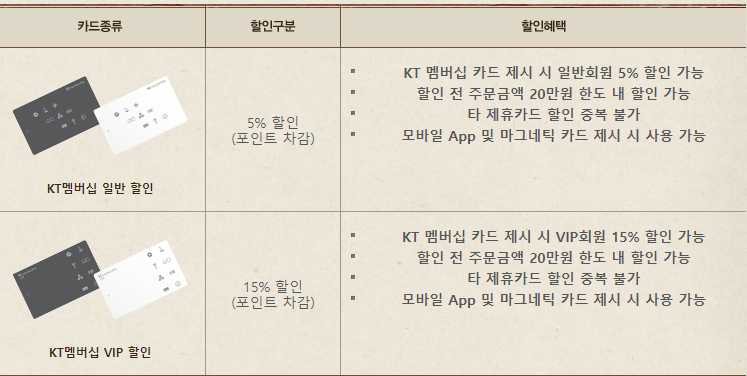 KT 멤버십 카드 VIP는 15% 할인혜택 또는 포인트 차감을 할 수 있으며, 일반카드는 5% 할인혜택 또는 포인트 차감할 수 있습니다.