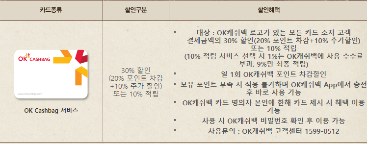 OK Cashbag 로고가 있는 모든 카드 소지 고객으로 결제금액의 30% 할인이 가능합니다.