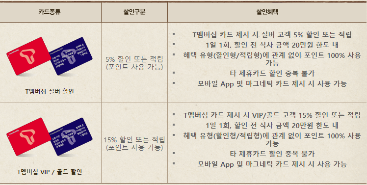SK텔레콤 T멤버십 카드 VIP 또는 골드카드는 15% 할인 또는 적립되며 포인트 사용도 가능하며, 실버할인은 5% 할인 또는 적립되며, 포인트 사용도 가능합니다.