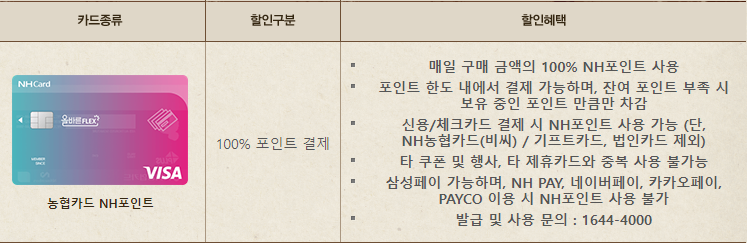 농협카드 NH포인트로 결제시 100% 포인트 사용가능합니다.