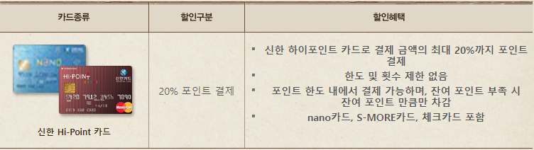 신한 Hi - Point 카드로 결제 시 최대 20% 포인트 결제 가능합니다.