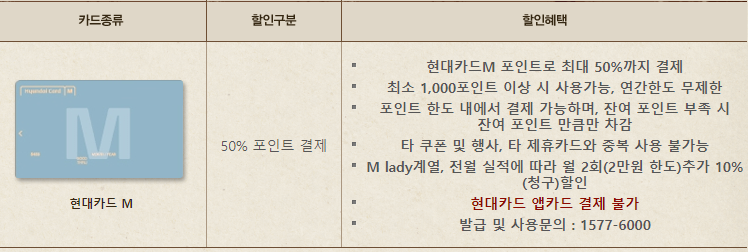 현대카드 M 카드 결제시 포인트로 최대 50% 결제 가능합니다.