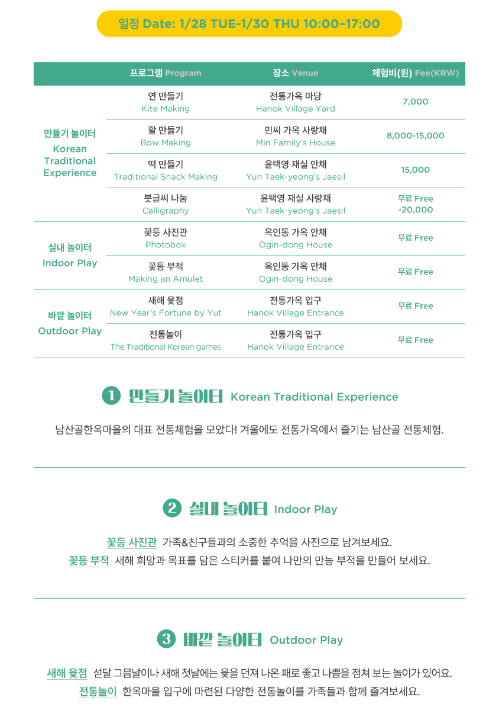 직접 참여하고 체험하는 프로그램이 많아 단순히 구경하는 축제가 아니라, 설날의 의미와 전통을 몸소 느낄 수 있는 기회를 제공합니다.