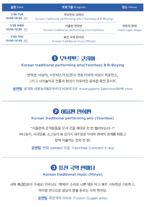 | 놀이마당 | 12:00 ~ 16:00 | 추억놀이 2종, 말뚝이 떡먹이기, 널뛰기 등 6종 |