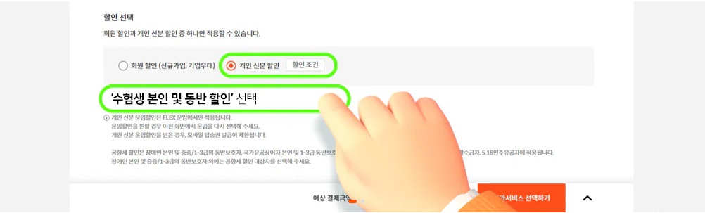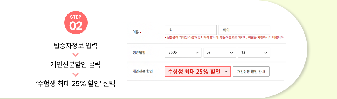 탑승자 정보입력에서 개인 신분할인 '수험생 최대 25% 할인'을 선택하세요.