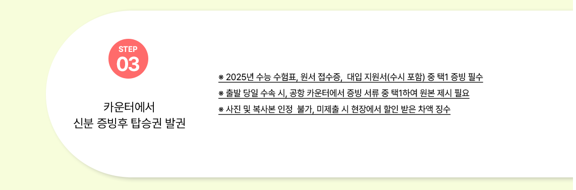 ② 출발당일 수속 시 공항 카운터에서 증빙 서류 택 1 하여 원본 제시 필요