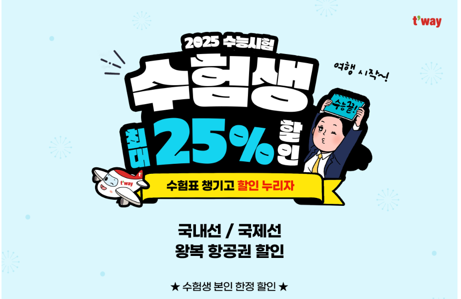 티웨이할공은 최대 25% 할인 행사를 진행 중이며, 국내선뿐만 아니라 국제선까지 왕복 항공원 할인을 실시하고 있습니다. 노선별 할인율이 다르며, 수험생 본인만 할인 대상입니다.