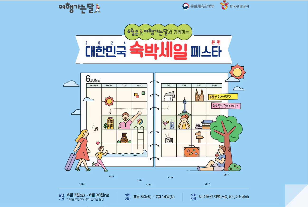 대한민국 [숙박세일 페스타]는 문화체육관공부는 한국관광공사와 함께 6월 3일부터 비수도권 지역을 대상으로 숙박할인권을 배포합니다.