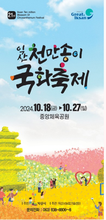 [익산천만송이국화축제]는 대형모형작, 다륜대작 등의 국화작품 전시와, 임금행차음악 '대취타', 소상공인 노래자랑, 댄스페스티벌 등 다양한 문화공연과, 해설사와 함께하는 도슨트 투어, 미리 쓰는 크리스마스 카드 등 다채로운 체험과 다양한 향토음식 먹거리를 즐길 수 있는 축제입니다. 자세한 내용은 아래에서 확인할 수 있습니다.