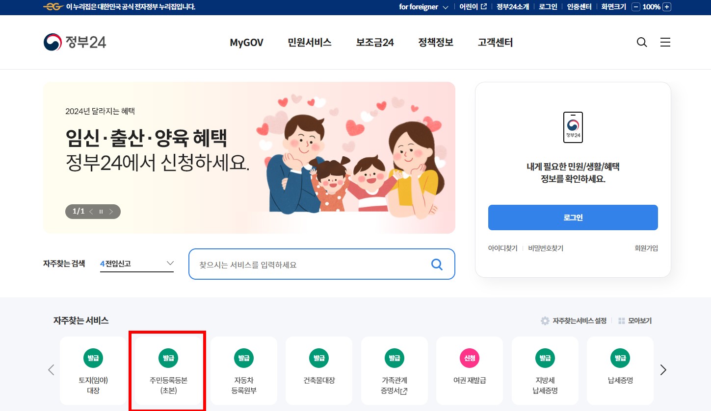 정부24(https://www.gov.kr/portal/main/nologin)로 접속을 합니다. 그러면 아래와 같은 화면이 나옵니다.