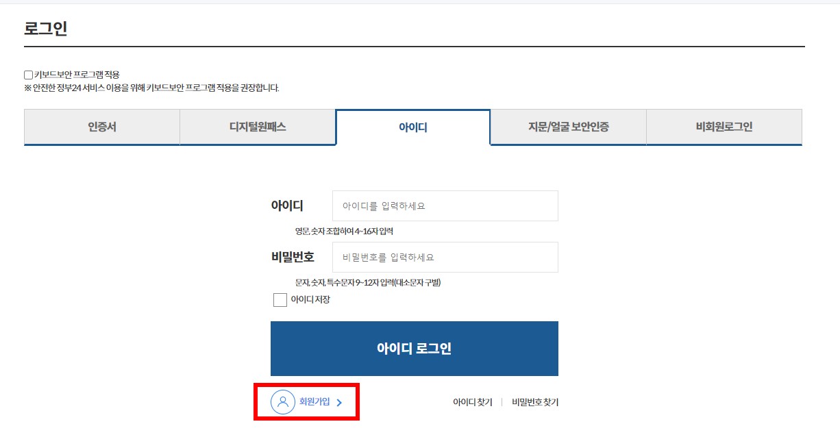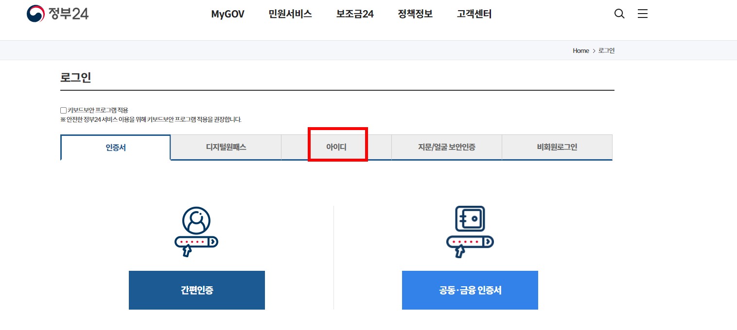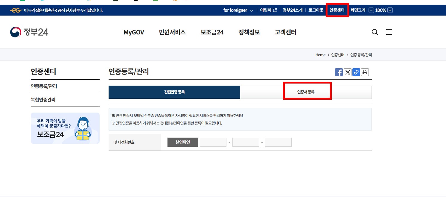 회원가입을 하시면 정부24로 로그인이 됩니다. 로그인이 되면 인증센터에 인증서를 등록하시면 됩니다.