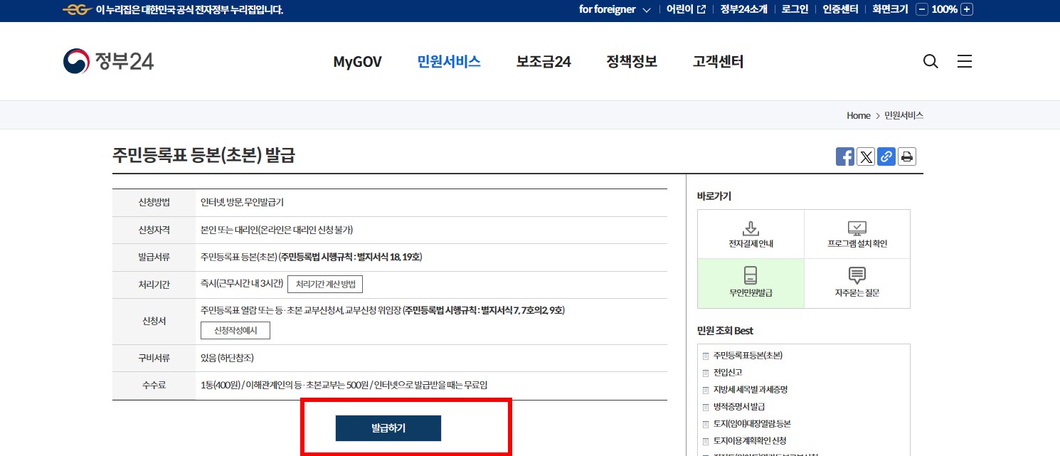 다음 화면으로 주민등록표 등본(초본)발급이 나옵니다. 하단의 발급하기를 눌러줍니다.