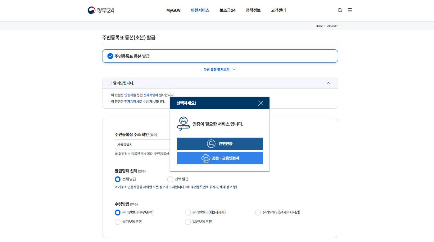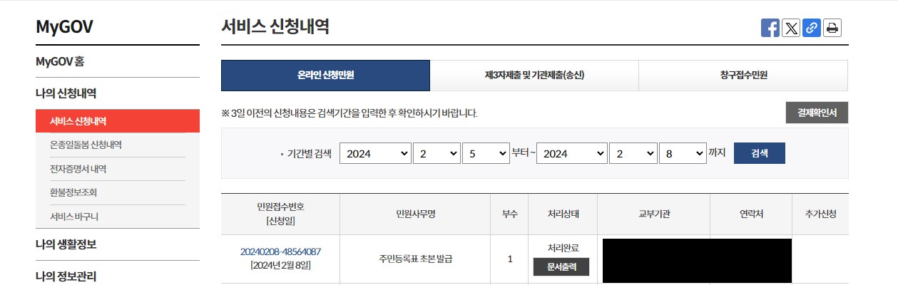 인증서로 로그인을 하면 서비스 신청내역이 나오고 문서출력을 하라는 메시지가 나옵니다.