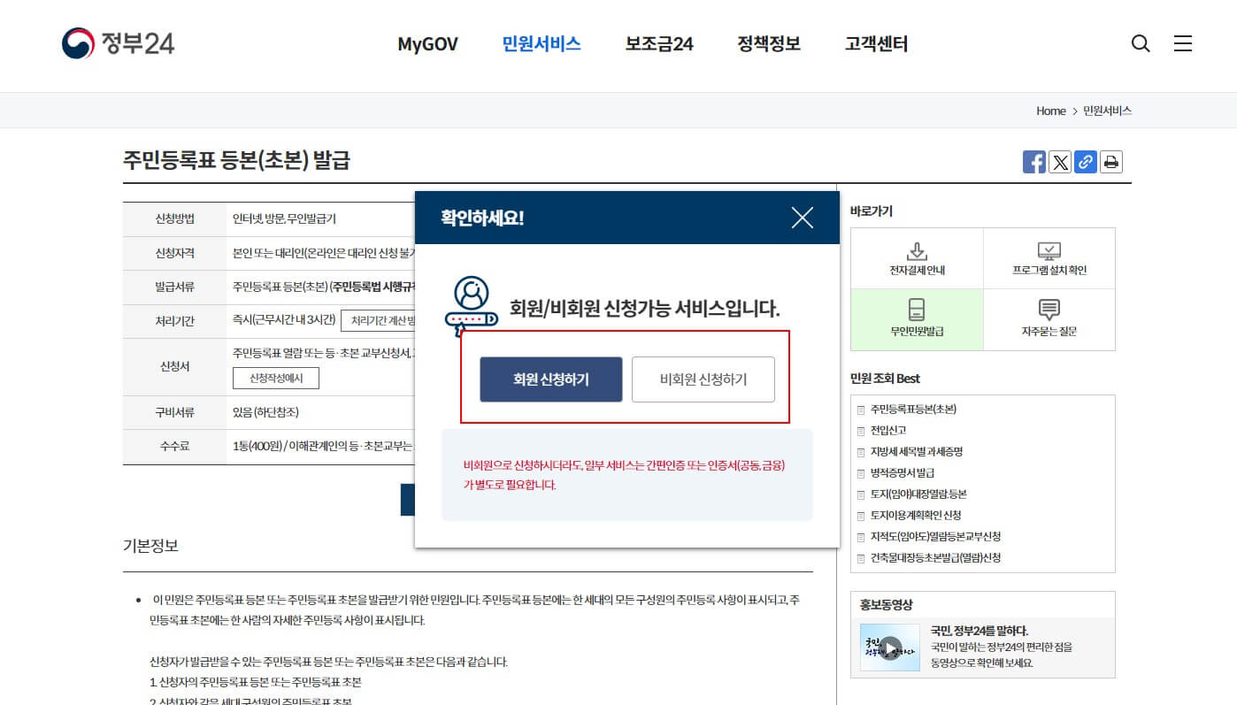 클릭하면 회원으로 신청하기 비회원신청하기가 나옵니다. 저는 비회원신청하기를 클릭했습니다.