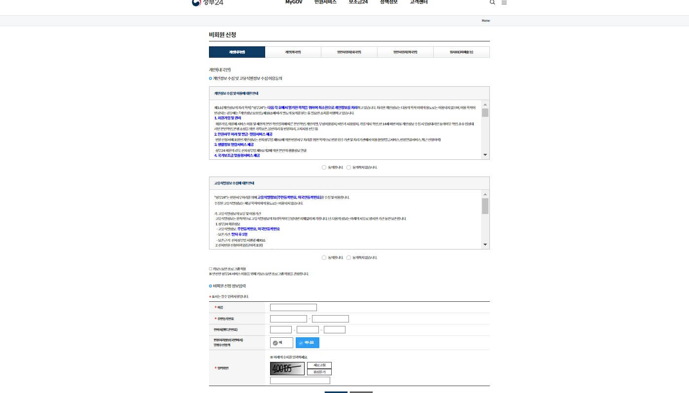 비회원 신청하는 화면이 나오면 동의합니다. 체크해 주고 이름, 주민등록번호, 입력확인을 하고 확인을 눌러주면 됩니다.