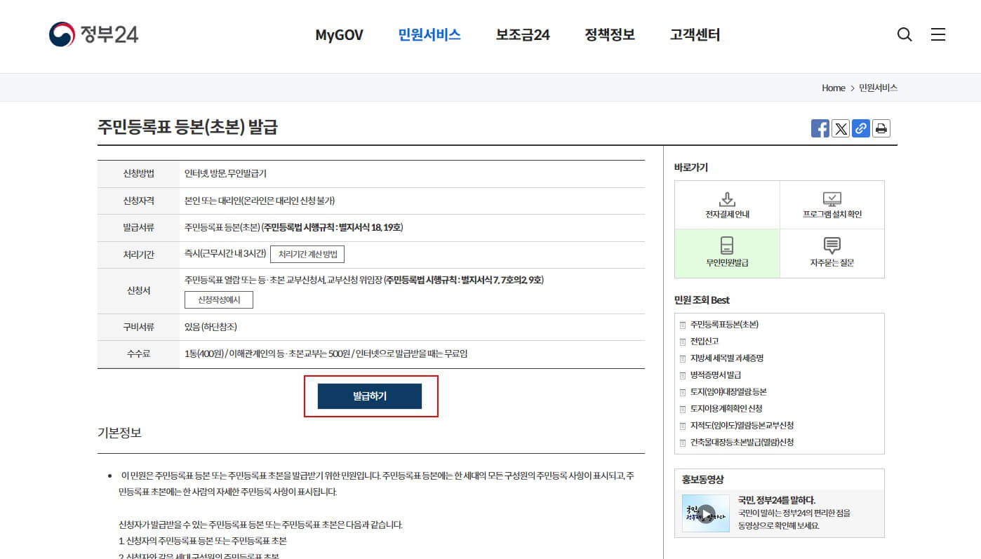주민등록표 등본(초본) 발급이 나오면 발급하기를 클릭하면 됩니다.