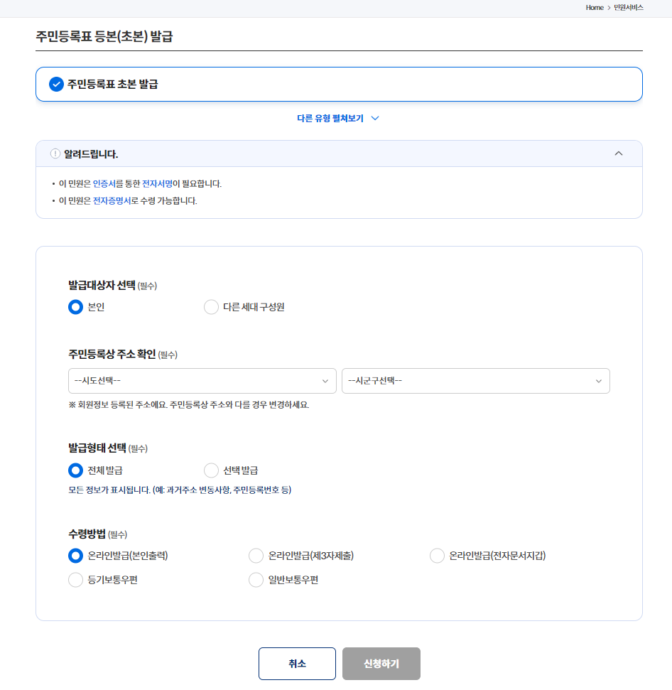 그리고 주소 및 발급형태 수령방법등을 체크해 주고 신청하기를 누르면 됩니다.