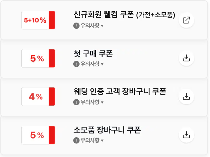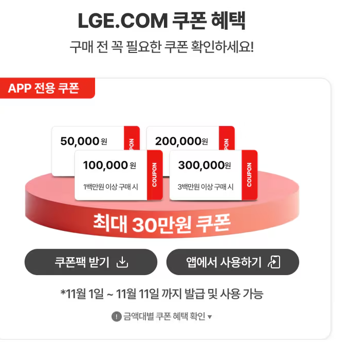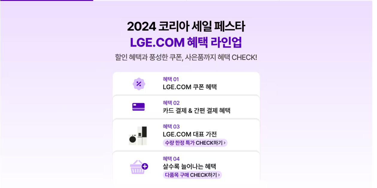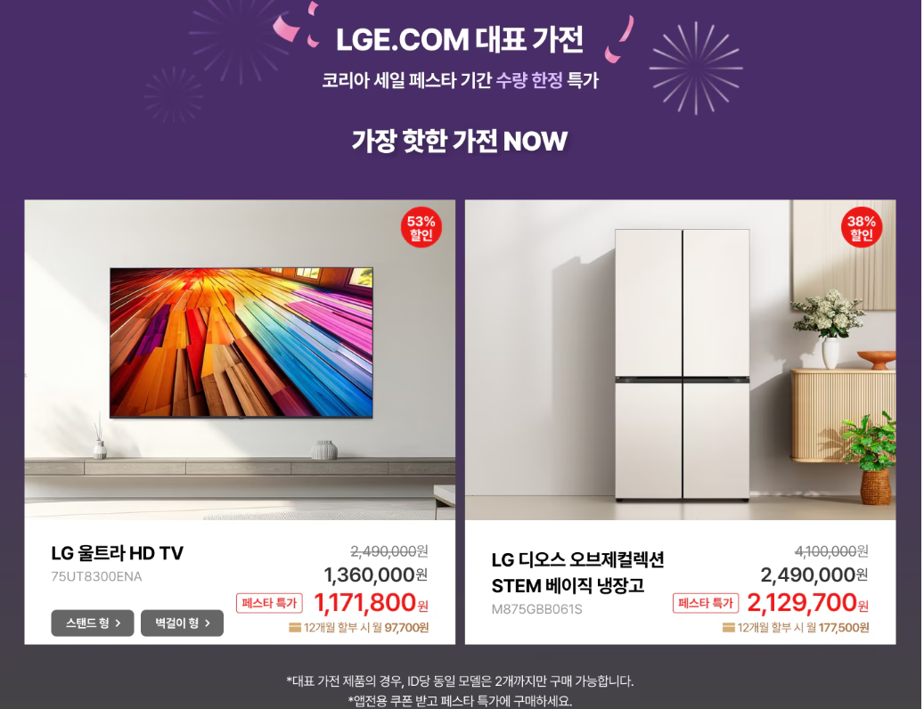 ② LG전자 : TV, 냉장고, 세탁기, 모바일 기기, 오디오, 청소기 등 12개 품목에서 다양한 할인을 합니다.