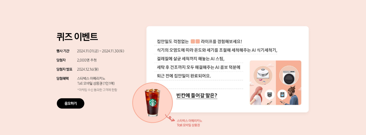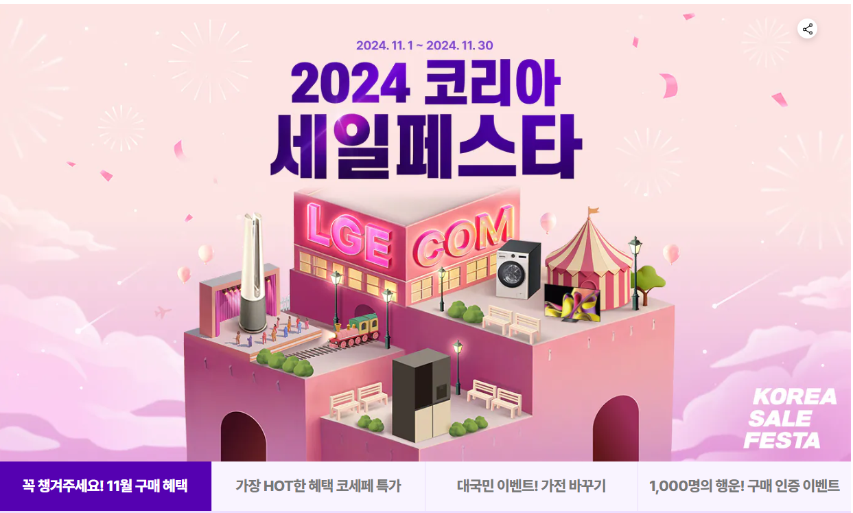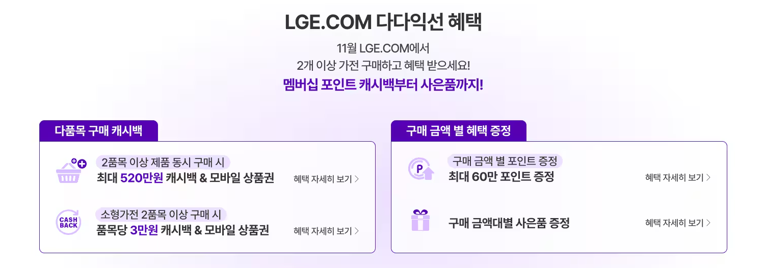| LG전자 | 총 12개 품목 할인, 누적구매시 최대 520만 캐시백 제공 | |