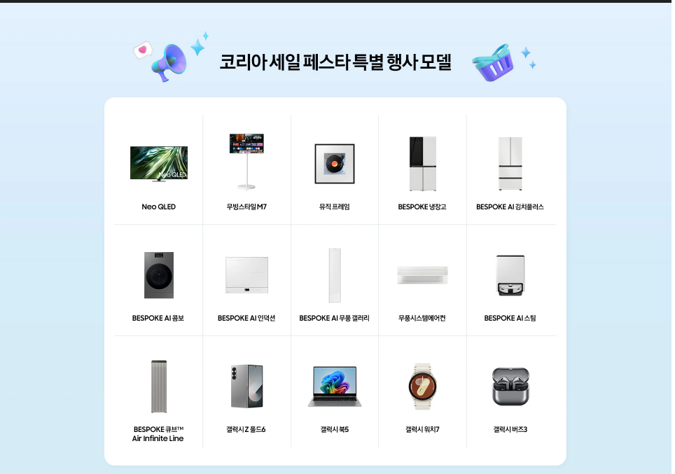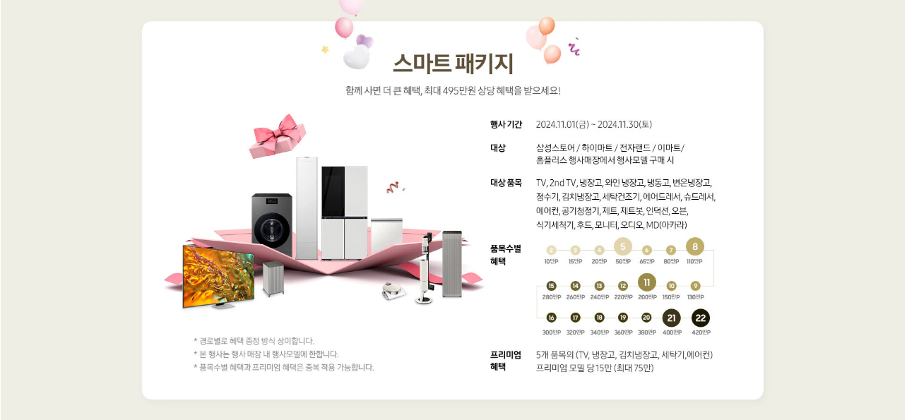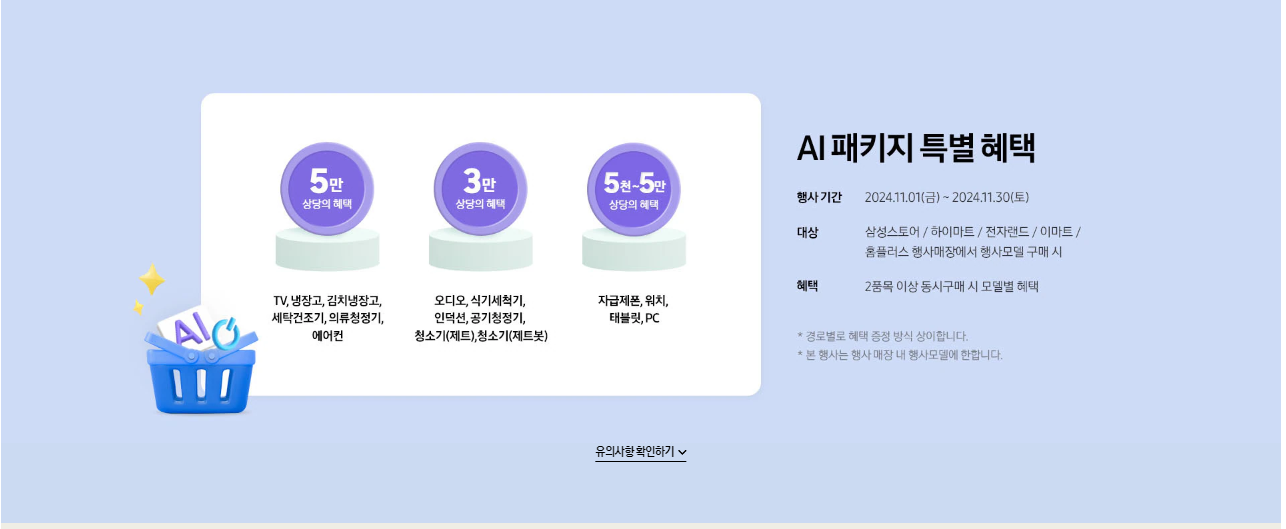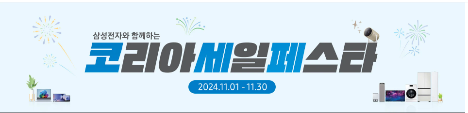 | 가전 | 삼성전자 | 총 15개 품목 할인, 누적구매시 최대 559만 포인트 제공 |
