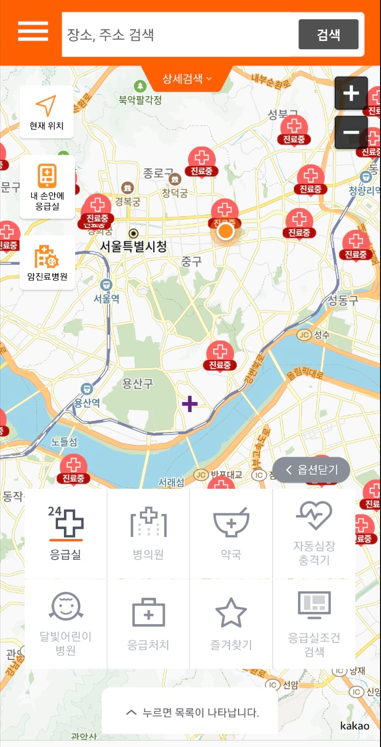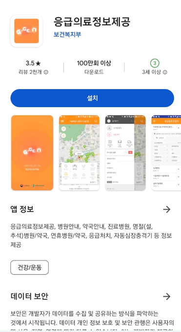 응급실 및 병원, 약국을 찾을 수 있으며, 민간구급차 검색, 자동심장충격기 찾기 및 사용법 등 다양한 정보들이 제공되어 있습니다.