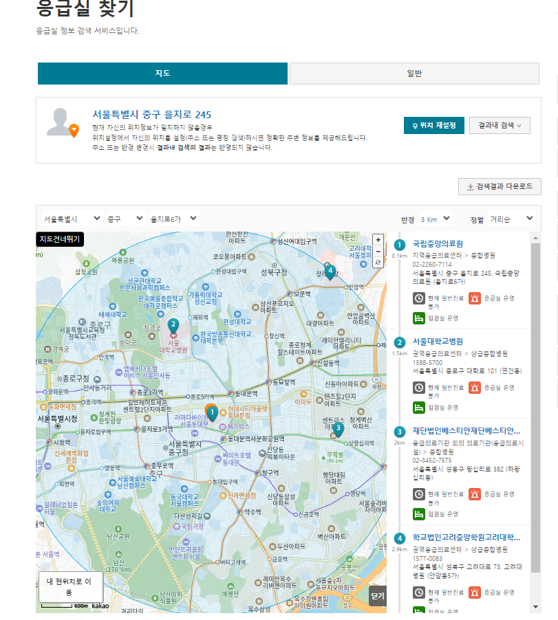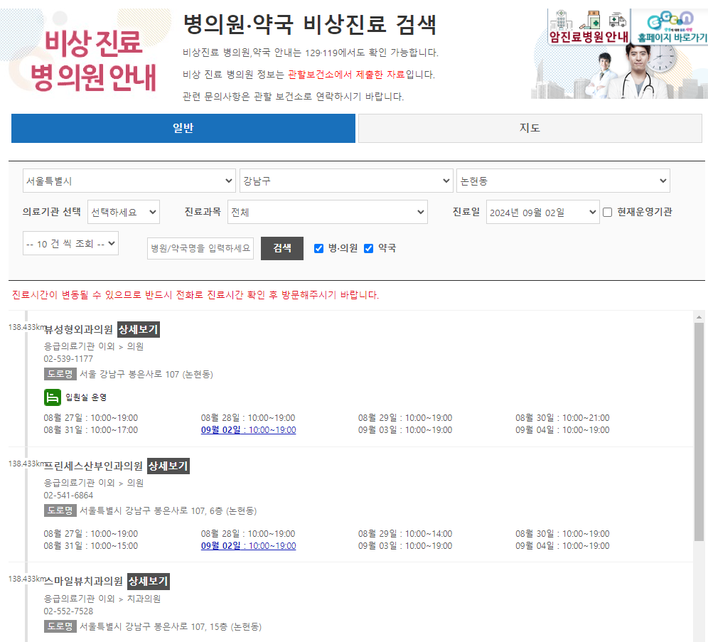 현재 위치의 주소를검색하면 병원이 나옵니다. 병원의 입원실 운영여부, 진료시간, 주소 등 간단한 정보가 나오며 진료시간이 변동이 될 수 있으므로 반드시 병원에 전화를 하신 후 방문을 하시기 바랍니다.