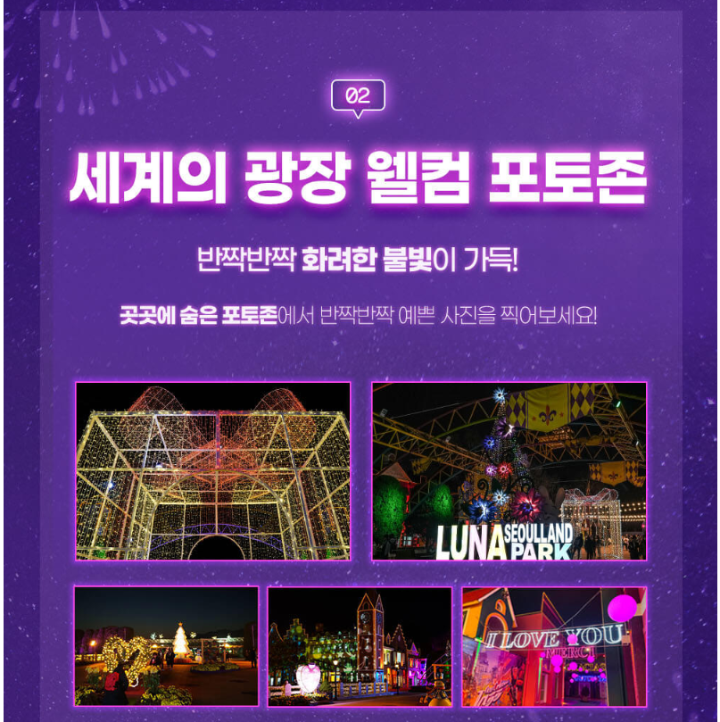 서울랜드불빛축제 루나파크는 밤이되면 서울랜드 전체공간이 형형색색의 반짝이는 빛과 음악으로 휩싸여 역동적인 다양한 색상의 조명으로 가득 찬 축제로, 축제는 다양한 구역으로 나누어져 각 구역마다 고유한 테마를 가지고 있으며, 포토존에서 멋진 인생샷을 남기셔도 됩니다.